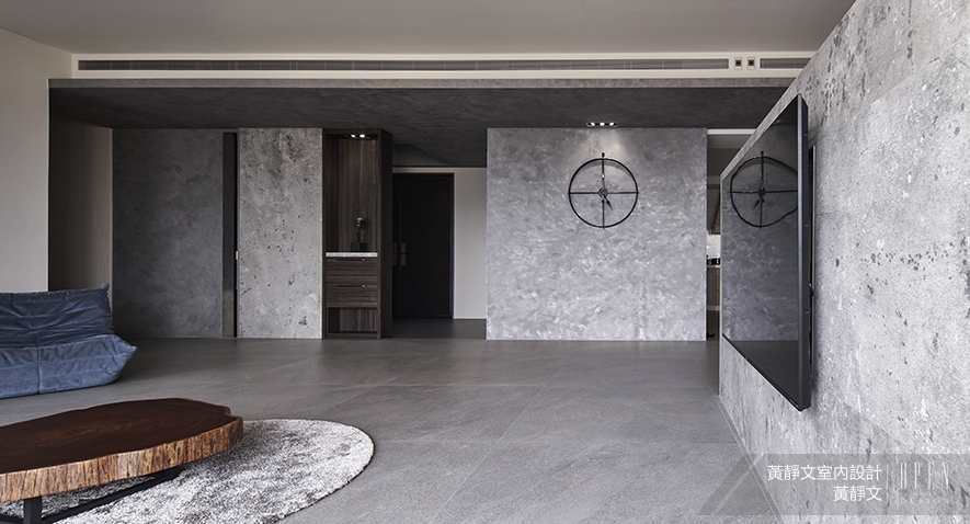 ▲公領域部分收納櫃選用深色木質,搭配色調沉穩的夜空藍、酒紅色貼地沙發,表現安定氣韻,結合灰白斑駁的地毯和低矮、邊緣不加修飾的原木桌,圍塑出家人或坐或臥,放鬆心靈的同歡場地,而懸掛於牆的深黑鐵件時鐘,融匯實用機能於美感形式,在空靈的場域創造藝術焦點。