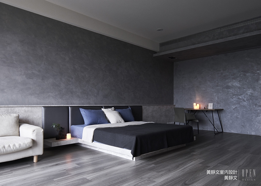 ▲主臥室以木質地坪搭配藝術漆料立面,賦予整體恬靜淡雅的氛圍。對比柔軟的皮革繃布,大片的塗料床背牆拉低縱向畫面,放大橫向視覺與空間感,顯得睡眠場域更加寬敞。