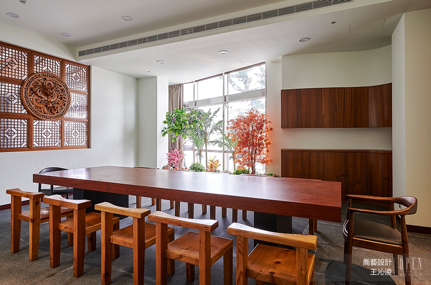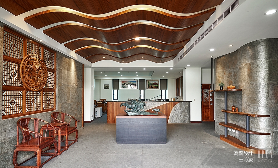 (圖)喬藝設計作品《南投凱嘉機械》,以純白襯底烘托檜木雕刻裝飾及家具的天然暖意,綴搭牆面俐落的石皮質感,打造異材相偕的辦公場所。