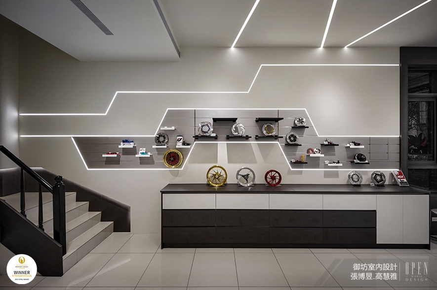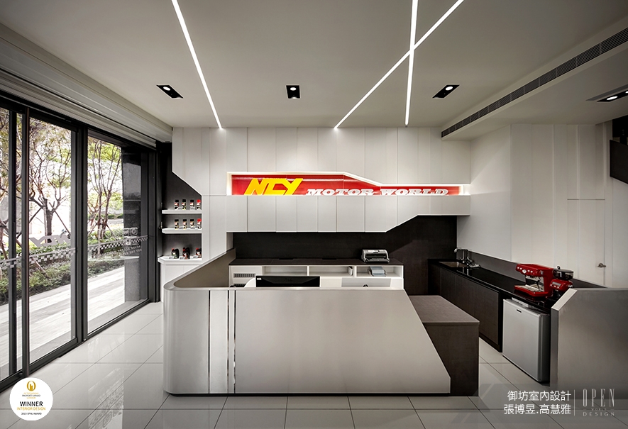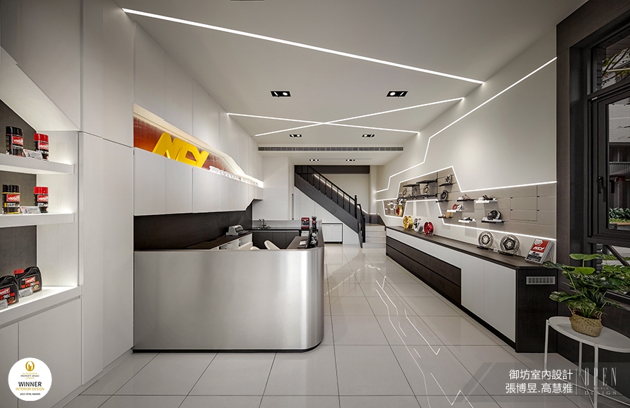 以電路板為發想概念,御坊室內設計 張博昱 設計總監 廣泛運用線條、鐵件元素形塑未來科技感,將販售機車精品的品牌形象化為實體,創造敞亮前衛的商空作品《勁速極境》,其呈現理念的時尚設計獲得本屆賽事「Winner」獎項,於國際舞台展現品牌實力!