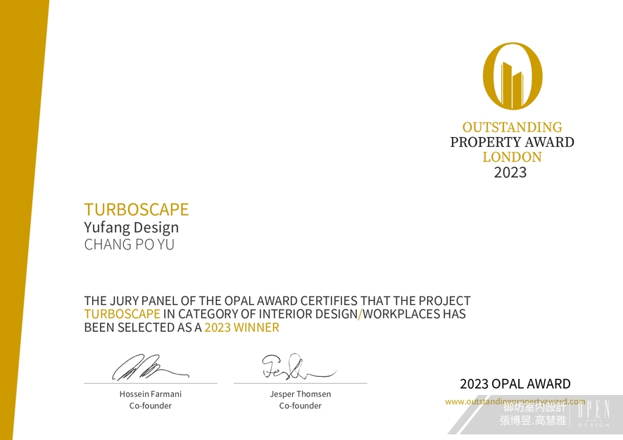 OUTSTANDING PROPERTY AWARD LONDON,OPAL(英國倫敦傑出地產大獎)由全球知名企業集團Farmani Group組織,並以招攬全球最佳建築師、室內設計師與房地產開發商為目標,在創造異業菁英聯合平台的同時,找尋各地最富創造力、革新感、社會影響力與永續性的設計方案。參與者有機會替自己最新穎的企劃,博得國際能見度,並且和產業的先驅及專業人士進行交流。