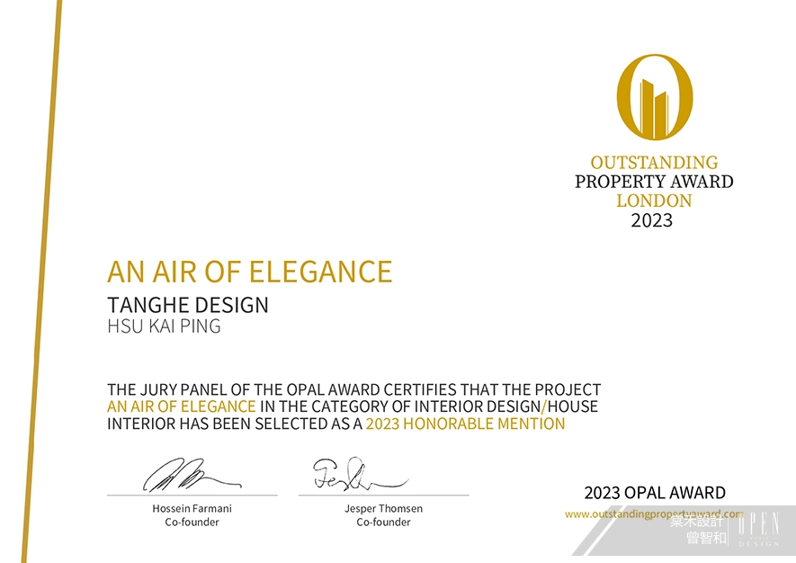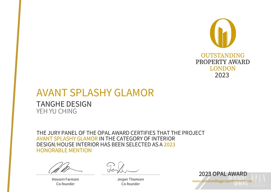 OUTSTANDING PROPERTY AWARD LONDON,OPAL(英國倫敦傑出地產大獎)由全球知名企業集團Farmani Group組織,並以招攬全球最佳建築師、室內設計師與房地產開發商為目標,在創造異業菁英聯合平台的同時,找尋各地最富創造力、革新感、社會影響力與永續性的設計方案。參與者有機會替自己最新穎的企劃,博得國際能見度,並且和產業的先驅及專業人士進行交流。