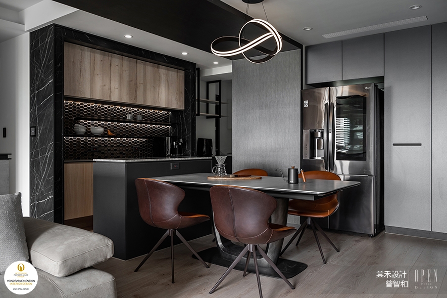 ▲線條優雅的餐廳吊燈下,擺設暖棕皮革椅與簡約的黑白色餐桌,側邊設置一座中島,作為料理、備餐緩衝區,餐櫥櫃則由木質、黑色石紋外框與仿金屬馬賽克組成,配上燈光映照鐵件層板,呈現異材質結合的時尚美感。