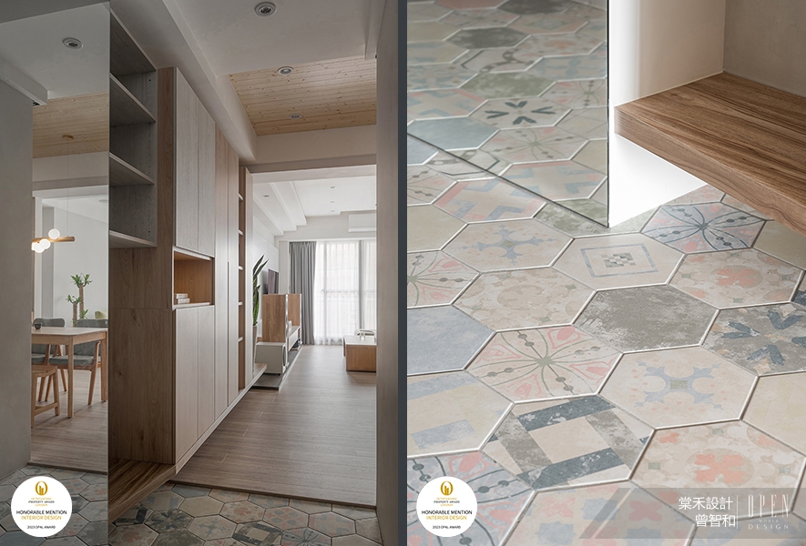 ▲以大片無印木質風格作為家的基底,在迎接屋主歸家及賓客到訪的玄關落塵區,選用柔和色彩的六角花磚,形成視覺上的對比意趣,讓極簡的風格下,有活潑的語彙。