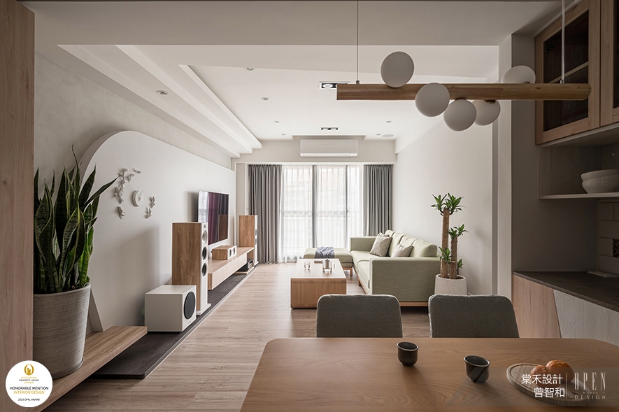 ▲因應屋主喜愛的無印風格,全室選用淡色木紋搭襯淺色家飾,當柔光灑落,柔和恬靜的氛圍,浸潤一室;電視牆作為家的端景,透過大片圓弧收邊,清朗氣質流淌而下。