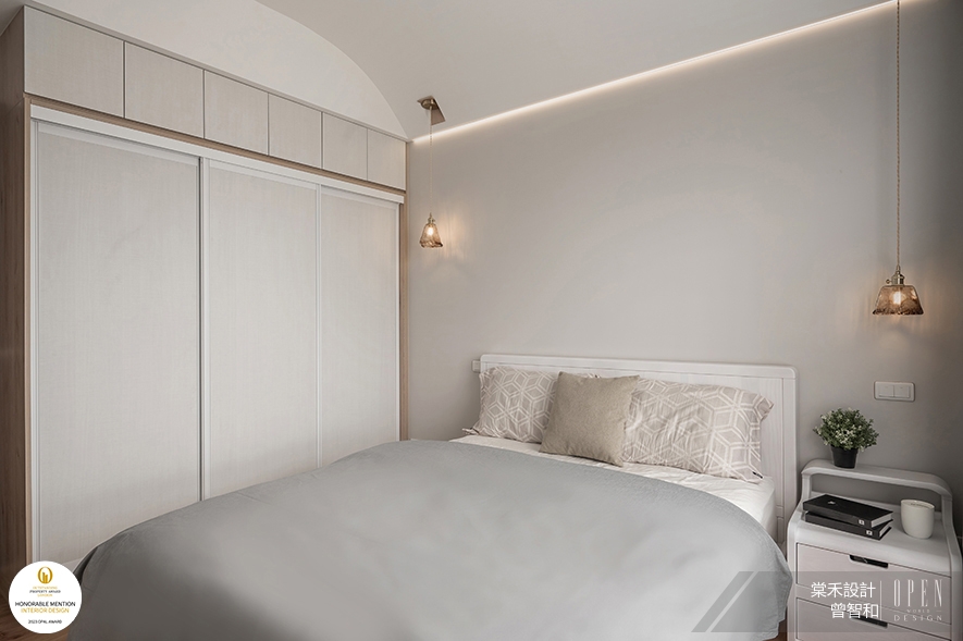 ▲主臥天花板做弧線設計,一方面為了遮蔽床頭上方的壓梁,另一方面則是在造型上做變化,壁面亦做跳色搭配,呼應客廳電視牆語彙。