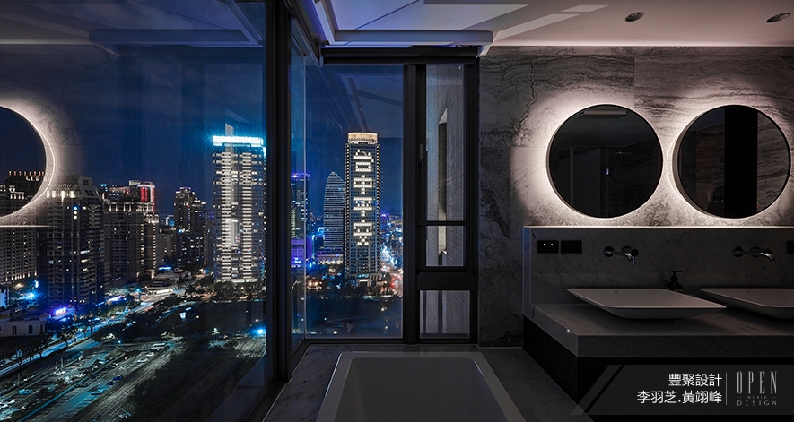▲臥室接續整體場域的灰白調性,點綴白橡鋸齒紋實木皮,使暖色木質圍塑舒適的睡眠質感,主臥衛浴則在義大利進口大板磚、大理石材的結合之下,形塑五星級飯店的精緻感,相偕蘊含圓滿意象的雙圓鏡,於夜色映照下更顯非凡品味。