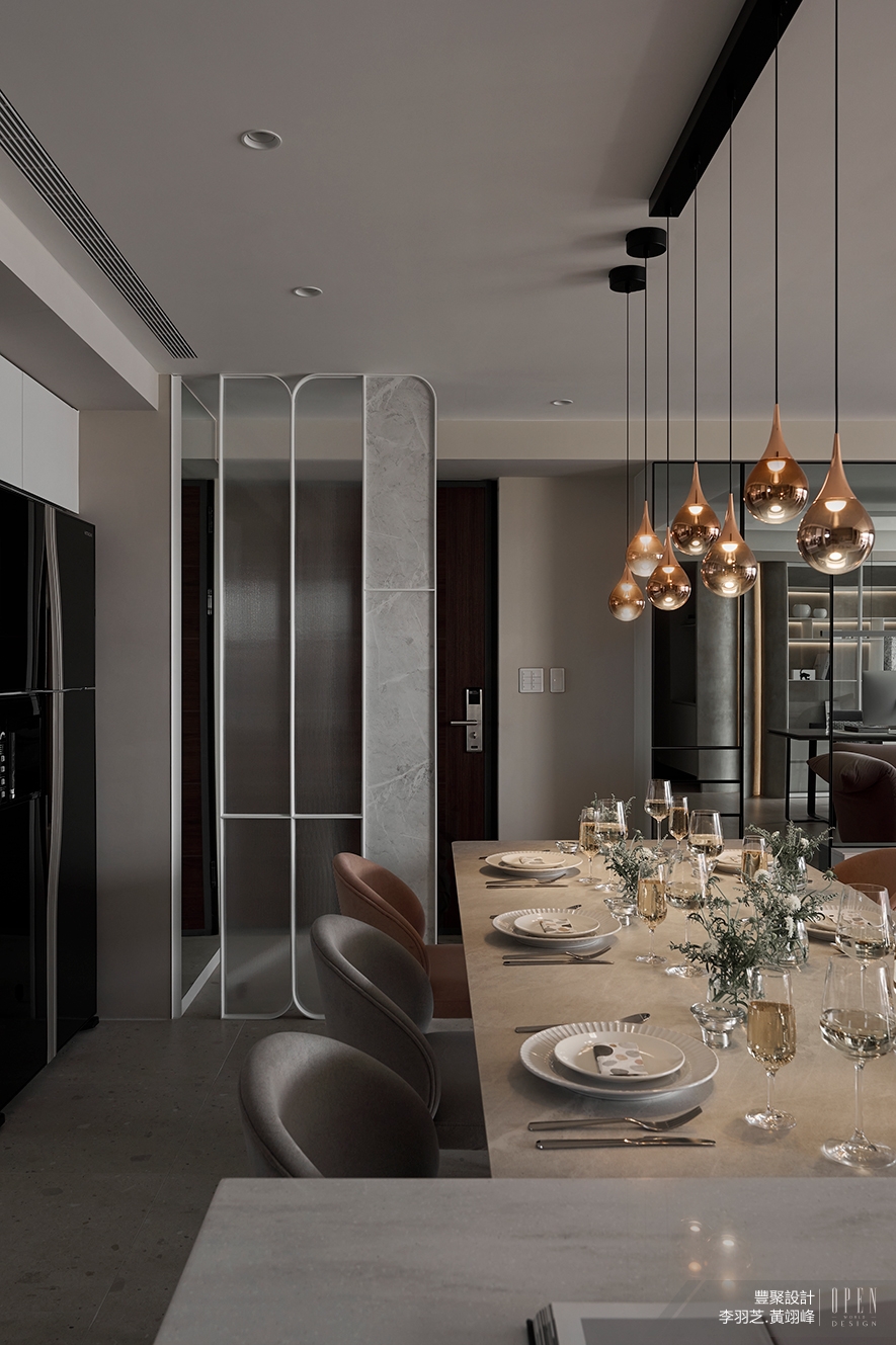 ▲配合業主接待訪客的需求,餐廳選配多人長桌,搭配灰、粉相間的麂皮餐椅和玫瑰金泡泡吊燈,呼應整體色調及現代風格,營造充滿儀式感的用餐氛圍;廚房則安排中島、流理台和電器櫃,滿足使用者備餐機能,構築賓主盡歡的聚會場域。