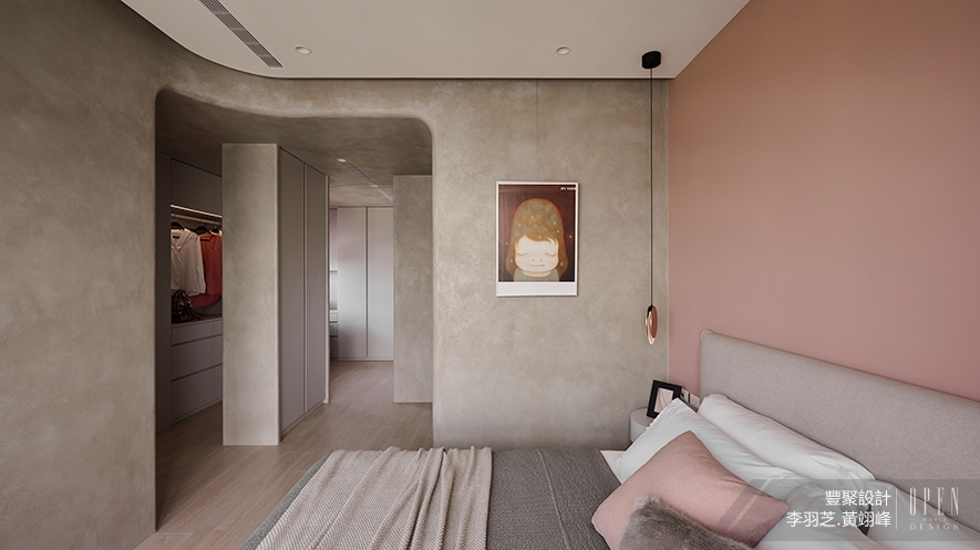 ▲主臥延續公領域大地色與霧粉色,並於床頭採用金屬造型吊燈,形塑安穩而不失浪漫情懷的舒眠環境,而通往更衣室的梁柱則以曲弧相接,形構猶如洞穴般的包覆性,賦予居者安全溫馨之感。