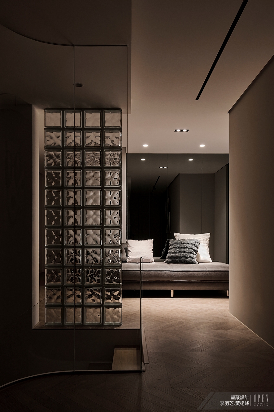 ▲本案將樓梯大方呈現於公領域,突破傳統格局,並藉懸浮設計、線燈與分別由強化玻璃、鐵件構成的扶手,打造輕盈靈動的視覺重點,另於上方左側壁面嵌入玻璃磚,解決轉角造成的視線死角,避免居者進出時無意間擦撞。