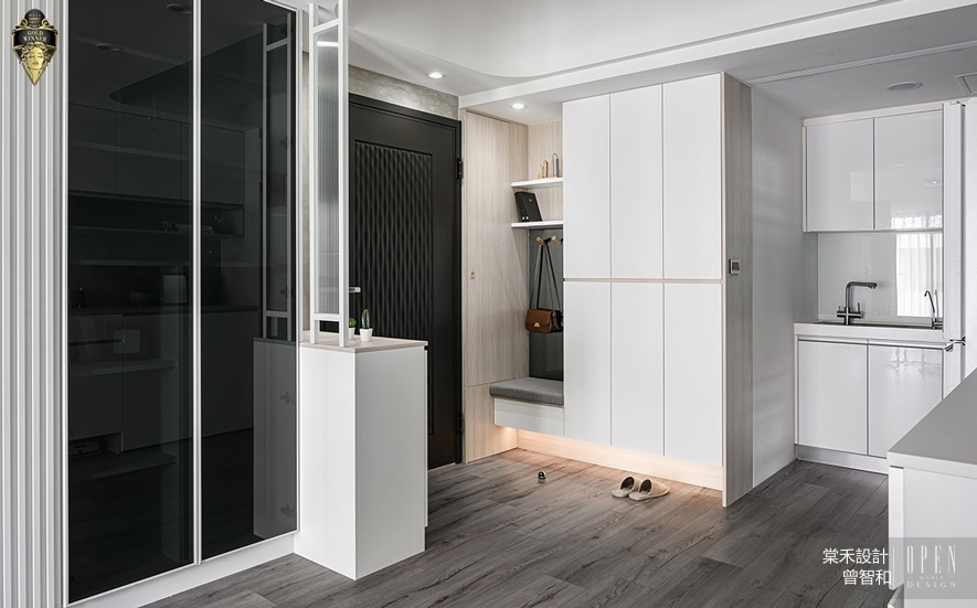▲玄關設計一面長虹玻璃小屏風,化解穿堂煞的風水疑慮,對側設置嵌入穿鞋椅的鞋櫃,其下方的懸空設計配合櫃底通風孔,保持櫃內乾爽透氣。