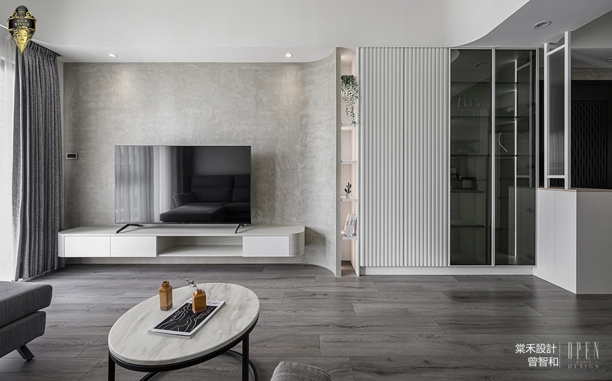▲素淨的客廳搭襯灰色系家具及電視牆,予人怡然舒適的氛圍,比鄰的展示收納櫃延續線條元素,並於內部加裝線燈,更加凸顯業主的藏品與家庭回憶。