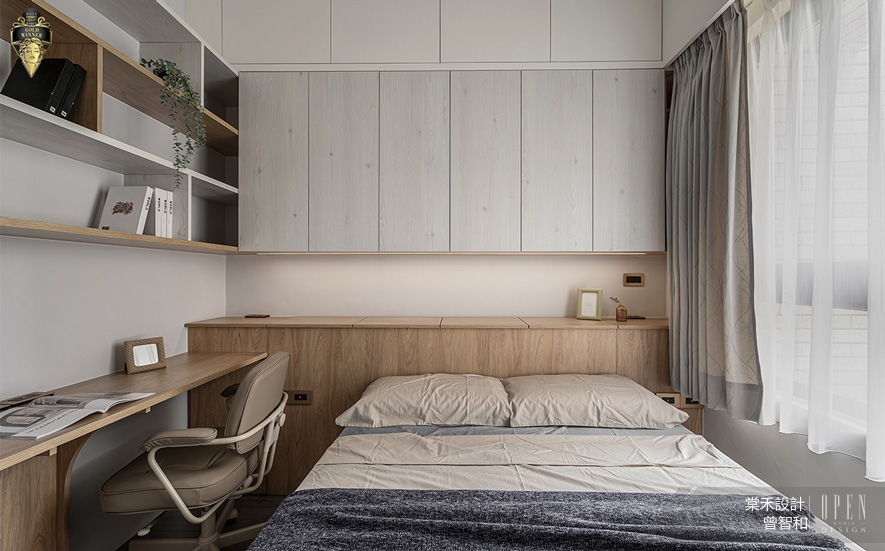 ▲主臥融匯書房及臥房,打造一處辦公、憩息皆宜的舒適天地,同時延續居者對收納的重視,床頭由下到上分別設置矮櫃、吊櫃和疊櫃,將充裕的儲納機能整合空間,兼顧實用與整潔。