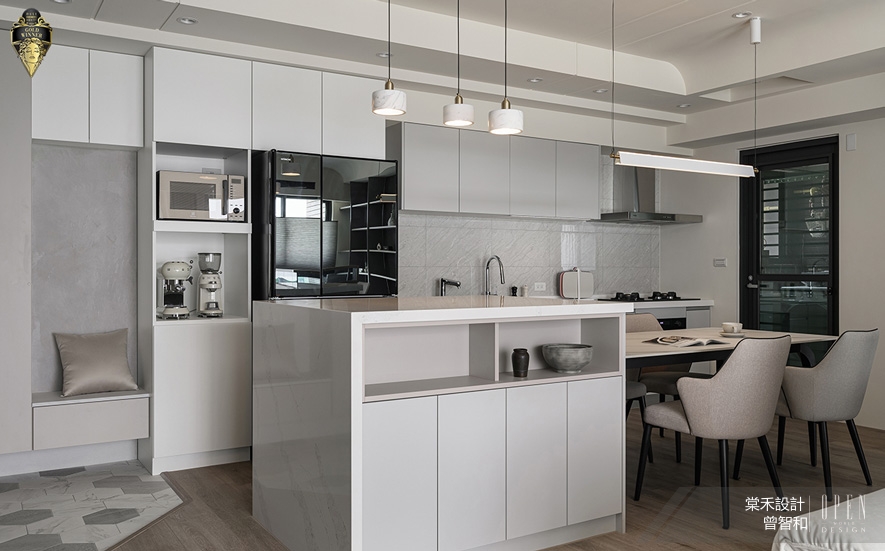 ▲餐廚區的中島上方特別加入三盞白色吊燈,與一旁同色餐吊燈相映襯,打造和諧一體的視覺感受,發散的柔和暖光則增添夜晚聚餐時的氛圍與情調。