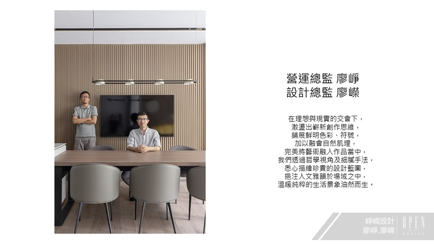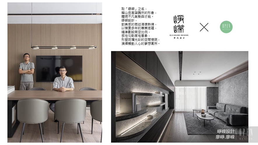 「在這個講求效率的世代,我們依舊重視與屋主的溝通和互動,因為人性化的溫度和創造力是無可取代的。」對 崢嶸設計 廖崢、廖嶸 設計師 而言,設計不僅僅是創意的體現,更多的是與人的交流,無論面對客戶或作品,以真誠的態度傾聽、處理每個環節,令最終成果圓滿而完整;秉持這樣的精神,期許崢嶸團隊在室內設計的道路上長久且出色地向前邁進。