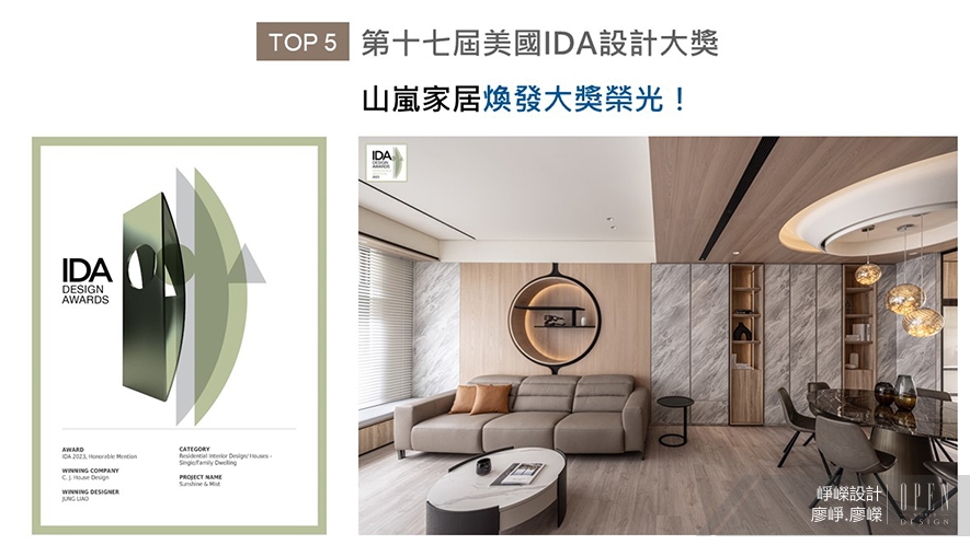 美國IDA 國際設計大獎(International Design Awards),以創新性、實用性和發展性等多種面向為評選標準,發掘各領域的新興人才。崢嶸設計 廖崢 廖嶸 設計師 將自然孕育萬物的意象融合家宅,透過色調柔和的大理石紋與間接照明,表現出《山嵐晨光》的薄明朦朧之美,此化虛為實的傑出手法,受此次賽事評審矚目,收穫「Honorable Mention」佳績!