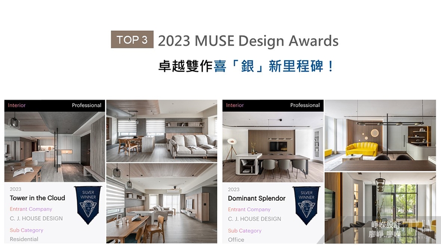 MUSE Design Awards以發掘全球設計繆思為宗旨,為建築、室內、時尚等領域提供全面的發光舞台。崢嶸設計的兩位設計師展現傑出的意象式設計,為家宅作品《排雲之境》呈遞天地相映的遼闊面貌,另以海岸原石為發想,詮釋清爽的辦公室《樸石蘊光》;兩作皆於2023賽事取得「銀獎」的好成績,亮眼表現再添品牌榮光!