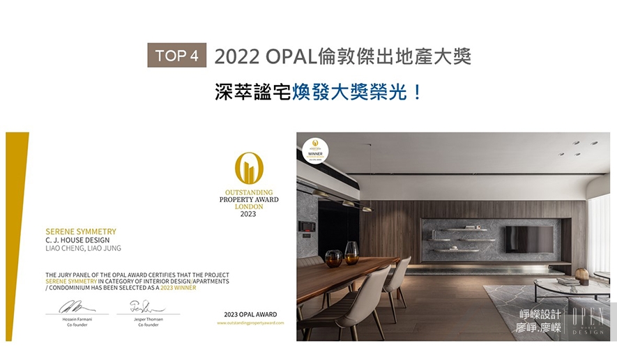 OPAL(英國倫敦傑出地產大獎)由全球知名企業集團Farmani Group組織,力求各地最富創造力、革新感、社會影響力與永續性的設計方案。崢嶸設計 廖崢 廖嶸 設計師 透過深色調、石紋、木質轉譯抽象的沉穩寧靜之感,搭配鏡面、鐵件的俐落線條和多層次光澤,為家宅《沉萃衍敘》挹注現代時尚風範,深得賽事評審讚賞,收穫「Winner」佳績!