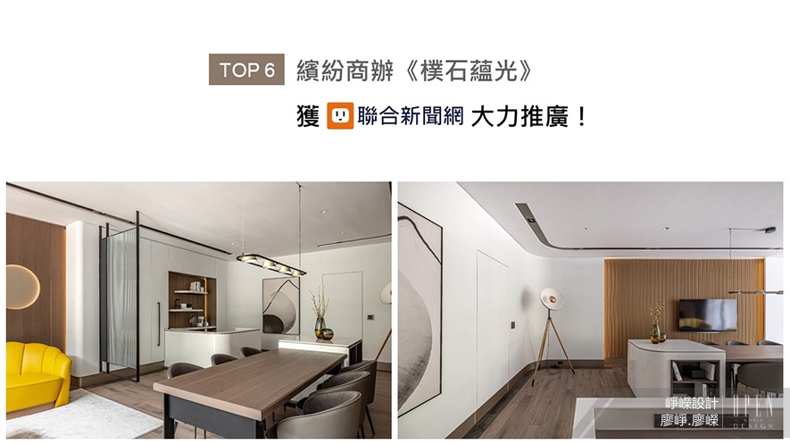 廖崢、廖嶸設計師運用淡雅木質、簡約線條和暗金色美耐板,為崢嶸設計辦公室《樸石蘊光》形塑清爽的現代北歐風,並將象徵品牌精神的原石形象,透過圓弧曲線表現於軟、硬裝,搭配排列整齊的實木格柵,展現團隊有條不紊的處事態度,精心之作躍上聯合新聞網版面!