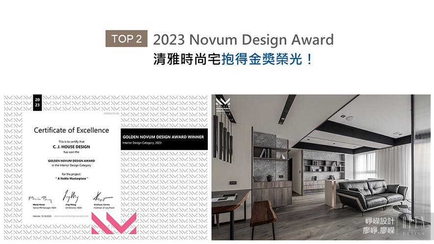 法國Novum Design Award倚著國際設計大賽後起之秀的姿態,廣納10大創意領域,包括建築外觀、室內空間設計和城市景觀設計等,為全球優秀設計者提供嶄新的展演舞台。廖崢、廖嶸設計師以純白漆與黑滾邊化解橫梁量體感,並藉廊道上方的玄色燈溝展現時光流動的意象,滿盈抽象之美的作品《墨白‧縱橫》,奪下2023 Novum Design Award「金獎」榮譽,盡展品牌美學底蘊!