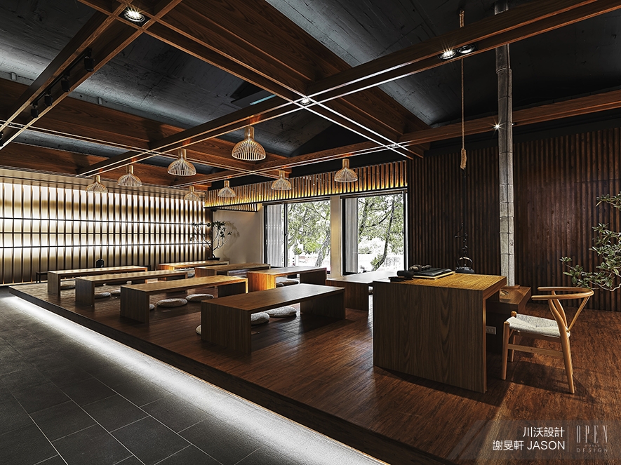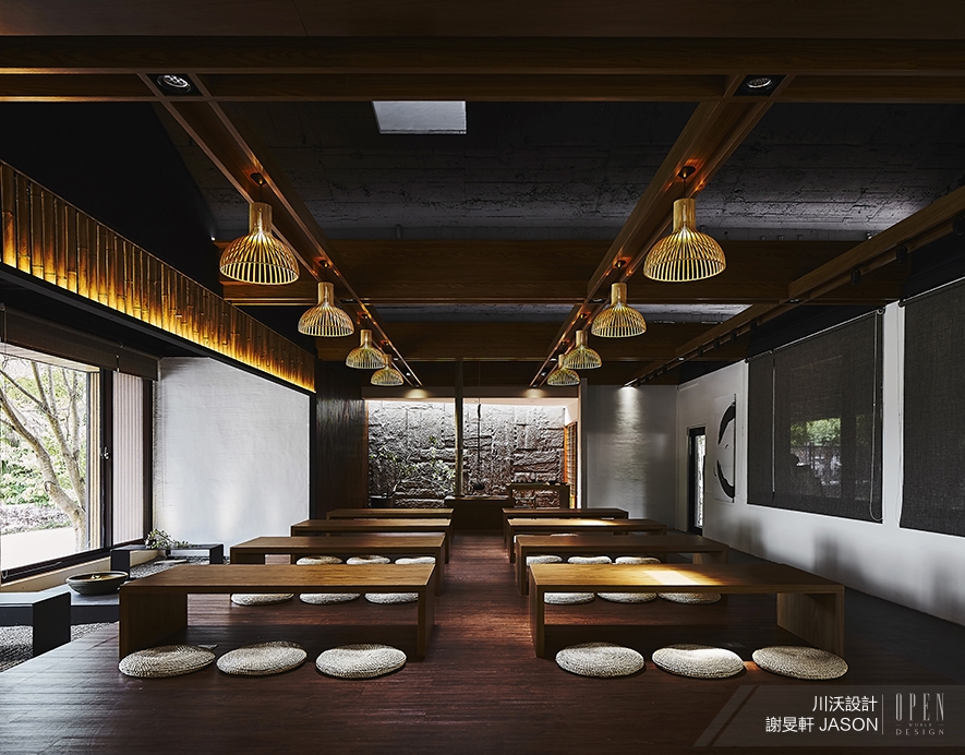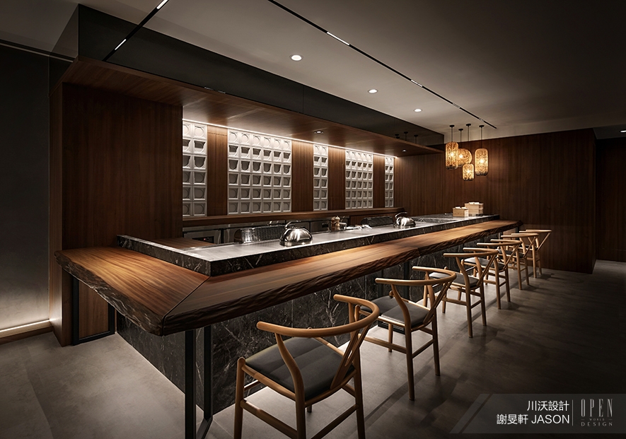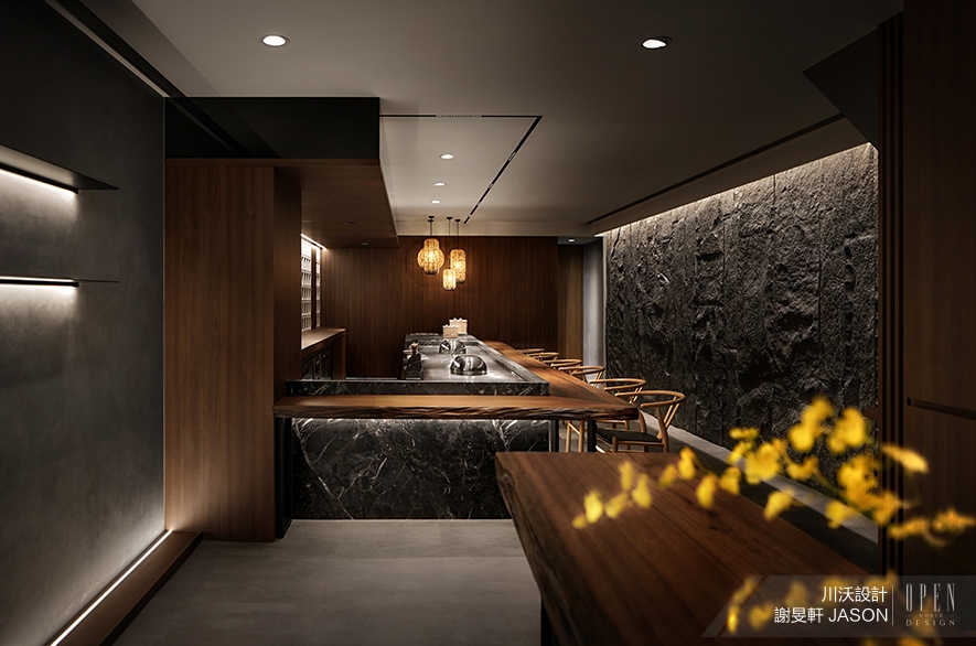 「可能和現代比較忙碌的生活方式有關吧!我也會希望人們進入我的作品時能把心靈靜下來。」或許從自身喜好出發、抑或由眾多旅行中的體悟而來,禪美學融入謝總監的創作,透過帶有自然原始感的材料,體現於公共空間《茶境思塾》和鐵板燒商空《饗》之中,令人在木、石共築的場域內,專注於眼前的茶水及美饌。