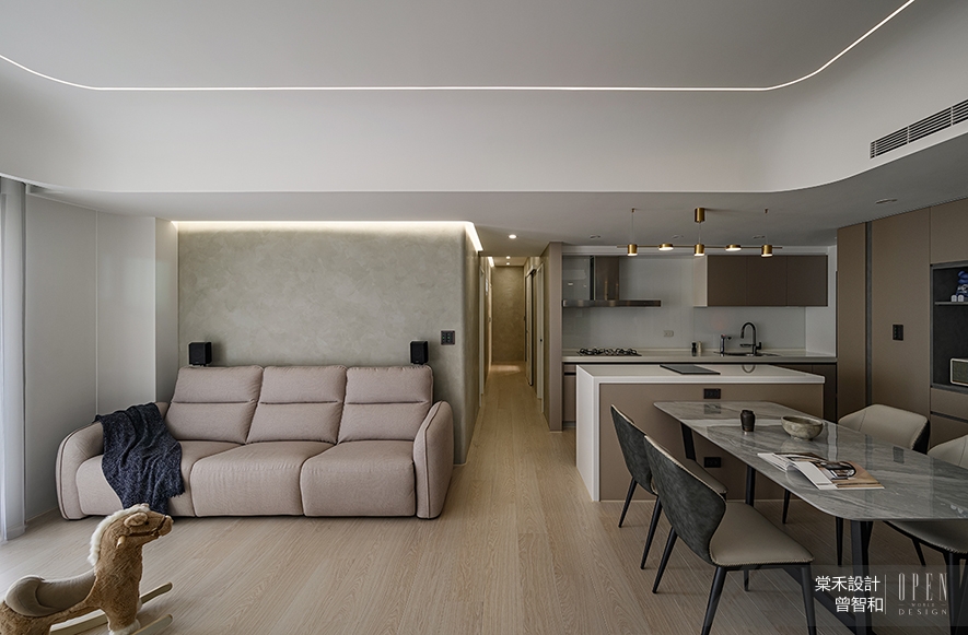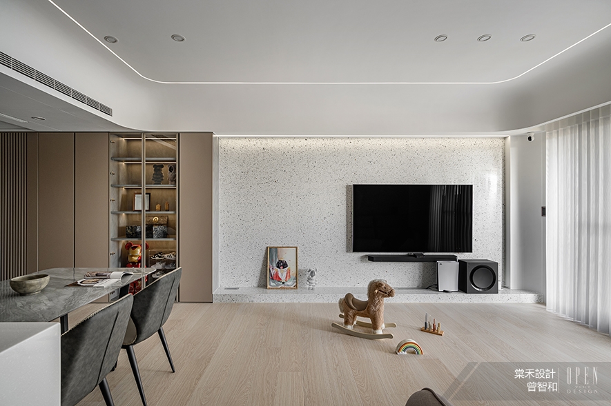 思及屋主家中育有一名學齡前幼童,開放式場域利於夫妻二人隨時注意幼子活動安全,而公領域選用圓角餐桌和軟質餐椅取代茶几、邊櫃等小型家具,降低孩童碰撞危險性,另於全案採用無甲醛的系統櫃及藝術塗料,搭配耐用無毒的塑合板材,共築健康環保的理想居所。