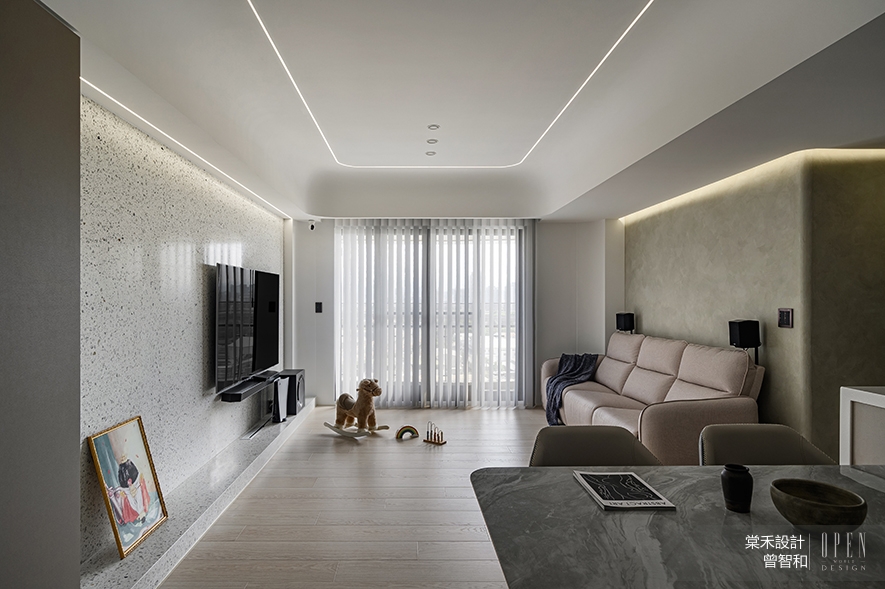 客廳沙發背牆施作米色藝術塗料,與水磨石電視牆、曲弧天壁簡約大方的調性相得益彰,呈遞一派時尚的現代風貌。