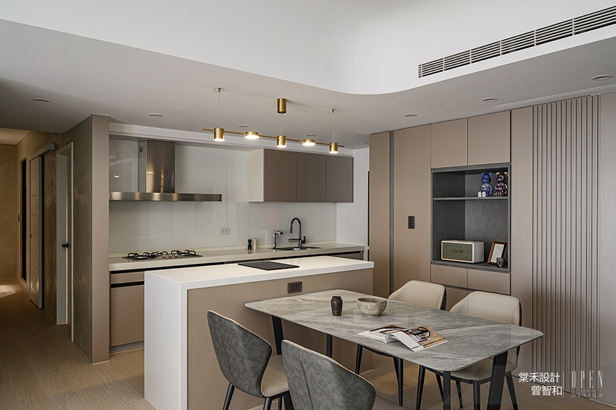 考量業主偏好簡餐的飲食習慣,餐廚區設置一座搭載IH爐的中島,方便使用者製作輕食,其下方立面結合收納功能,提升取放廚具、碗盤的便利性,此外,電視牆旁規劃一座半開放櫃體,供住者展示、收藏喜愛的模型和球鞋,對側餐邊櫃則藏入通往後陽台的暗門,內部畸零地劃為儲藏室,充分滿足儲納打掃用具和日常用品的需求。