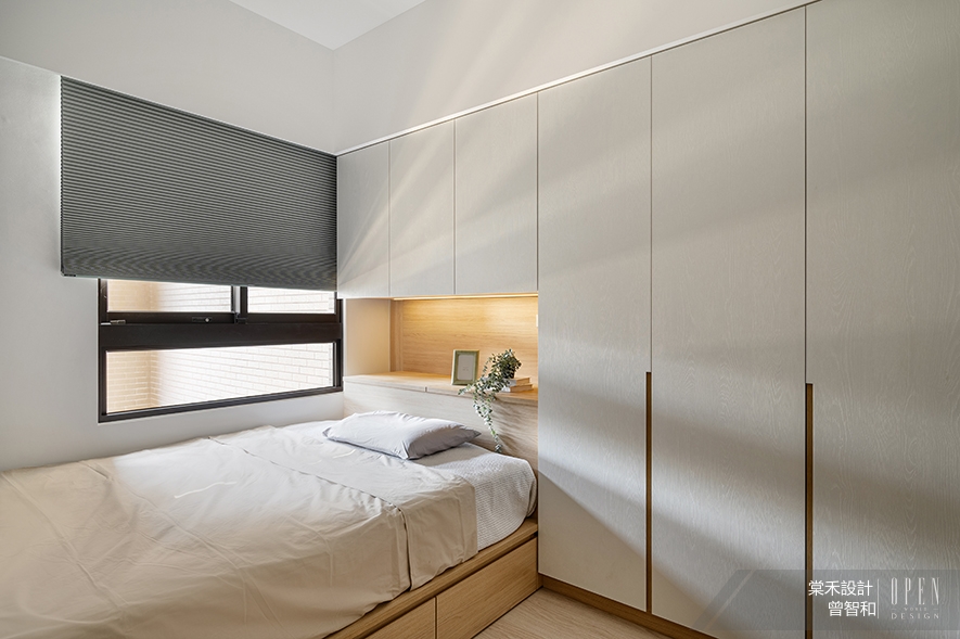 小孩房以木白色調結合素色天花板,勾勒整潔的樸素畫面,賦予住者輕盈無壓氛圍,並於床背牆規劃整面壁櫃,輔以床下地台抽屜、床頭掀櫃設計,構築收納充裕的舒適空間。
