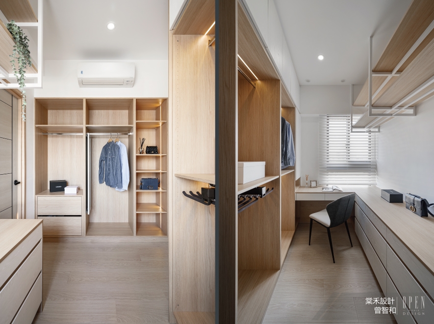 主臥更衣間以木質為基調,綴搭留白牆面和純白鐵件,彰顯大量木紋的柔潤暖意,內部置入開放式衣櫃及收納層架,提升業主拿取、整理衣物的效率,且於窗畔規劃梳妝台,其台面延伸至旁側矮櫃,塑造整齊劃一的觀感。