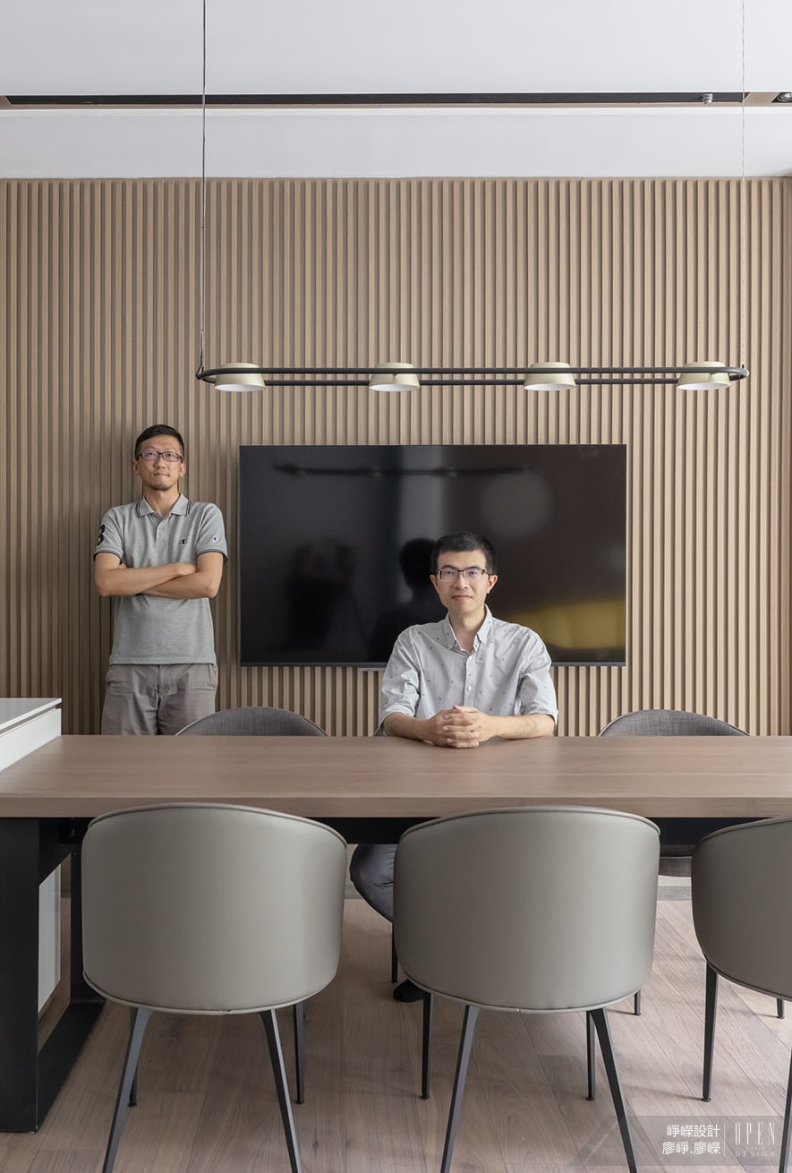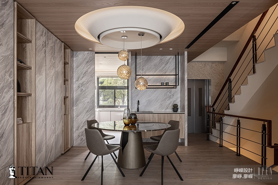 崢嶸設計 廖崢 廖嶸 設計師 回應業主對社交、孝親和育兒的需求,一樓規劃開放式格局,打造可容納多人活動的寬敞公領域,另設置一座電梯供長輩上下樓,也方便屋主未來搬運嬰兒車使用,展現便利機能與安全性;實現居者期許的溫情住宅《山嵐晨光》深受賽事評審推崇,一舉獲得「金獎」殊績!