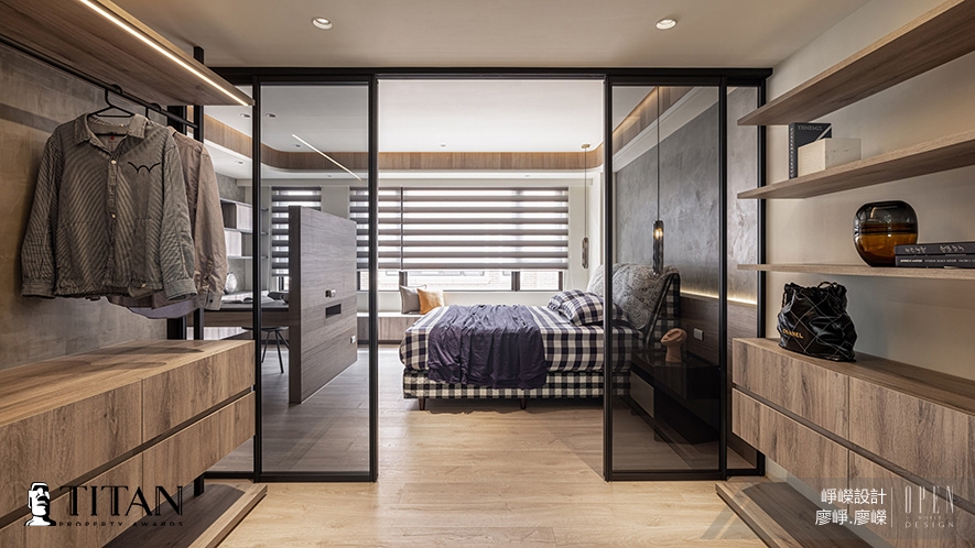 ▲主臥床頭選用質感沉穩的灰色斯曼特漆,並於天壁內凹側、櫃面和電視半牆陳貼木皮,打造靜謐安穩的睡眠場域;更衣間入口裝設清玻鐵件拉門,不僅放大此處空間感更引入戶外陽光,結合柔和的反間接照明,營造豐富的光影層次。