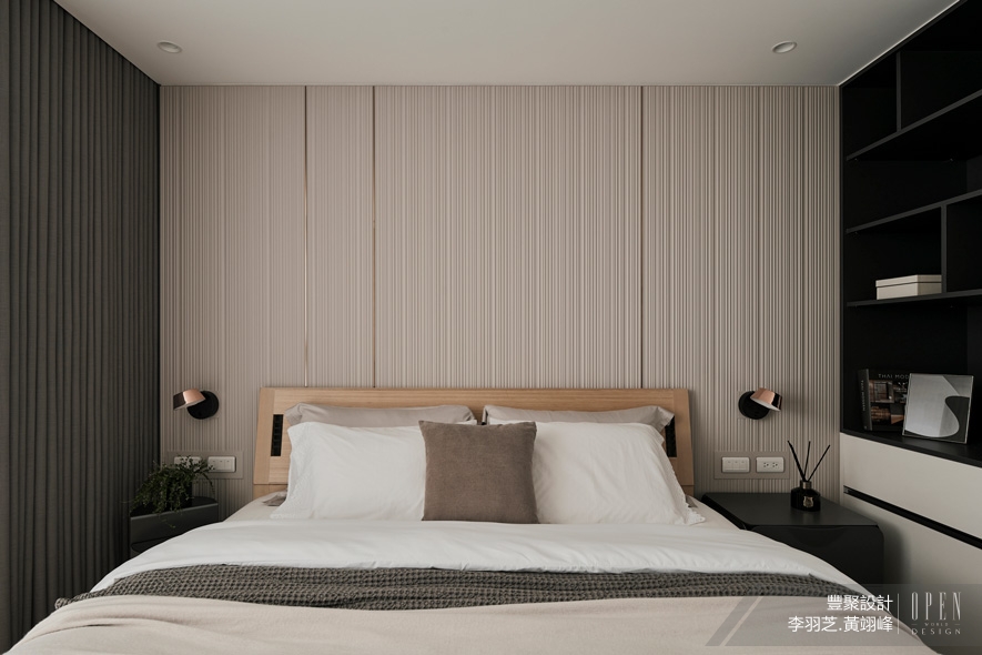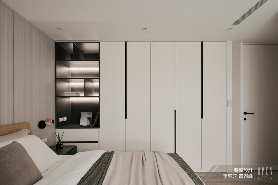 主臥床頭牆選用米色線板,透過柔和色調和有序線條營造安寧的舒眠場域,旁側黑白雙色的展示收納櫃則搭配線燈,不僅滿足收納機能,更創造多層次的質感氛圍。