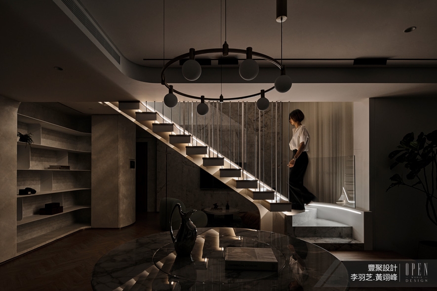 突破傳統樓梯格局,本案將其大方呈現在公領域,藉由懸浮設計、線燈及分別由強化玻璃、鐵件構成的扶手,打造輕盈靈動的視覺重點,維持家宅內視野通透也無形區隔客、餐廳,另考量發生碰撞意外的可能,所有清玻皆貼有防爆膜,提升受到衝擊時的安全性。