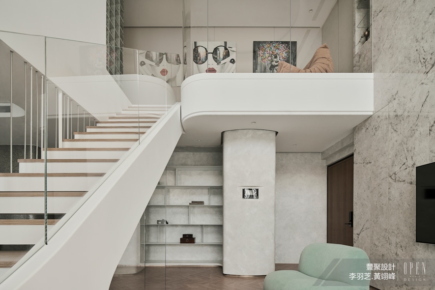 樓梯上方以清玻圍塑一處閱讀區,供人遠眺窗景、享受自在讀書時光,對側則於壁面嵌入玻璃磚,解決轉角造成的視線死角,避免居者進出時無意間擦撞。