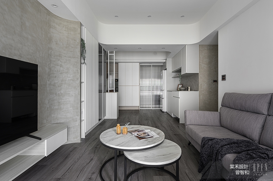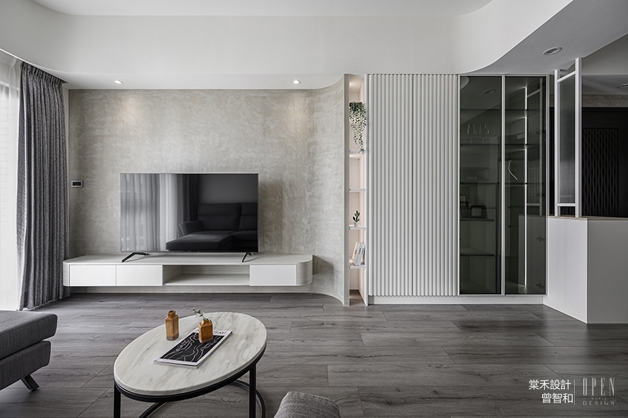 本案以純白搭配灰色藝術漆,輔以線條元素,共組清爽俐落的現代風情;公領域天壁匯入曲弧元素,與曲面電視牆相呼應之餘,更添一抹柔和韻味,結合滿載暖意的木地坪、深色調軟裝,營造敞亮溫馨家居。