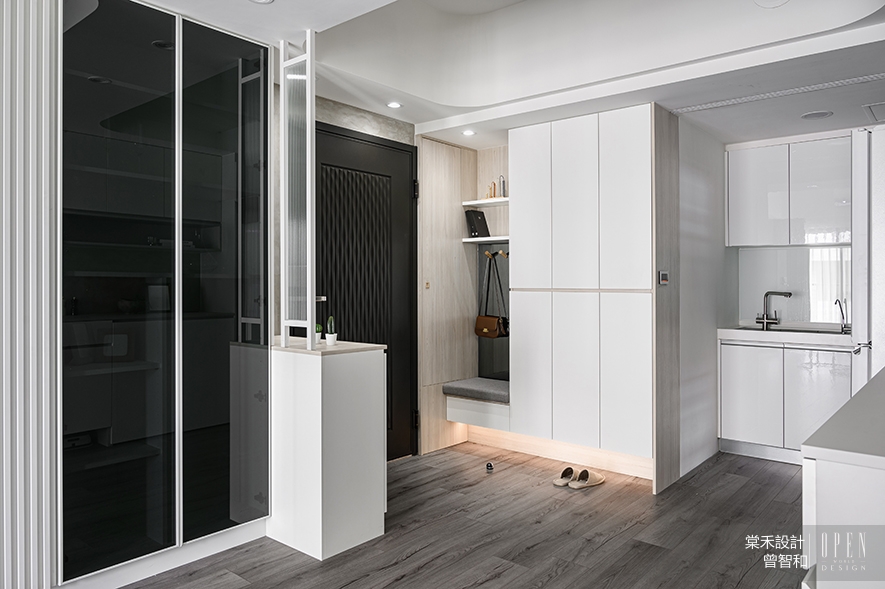 玄關設計一面長虹玻璃小屏風,化解穿堂煞的風水疑慮,對側設置嵌入穿鞋椅的鞋櫃,其下方的懸空設計配合櫃底通風孔,保持櫃內乾爽透氣。