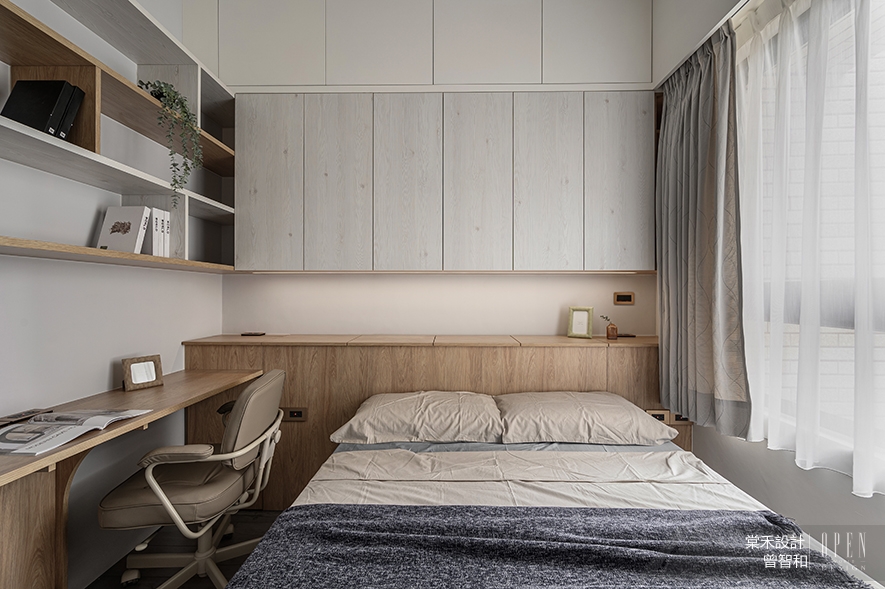 主臥融匯書房及臥房,打造一處辦公、憩息皆宜的舒適天地,同時延續居者對收納的重視,床頭由下到上分別設置矮櫃、吊櫃和疊櫃,且於床尾的衣櫃上方外加一層儲藏櫃,將充裕的儲納機能整合空間,兼顧實用與整潔。