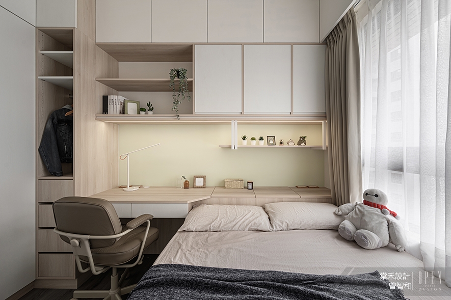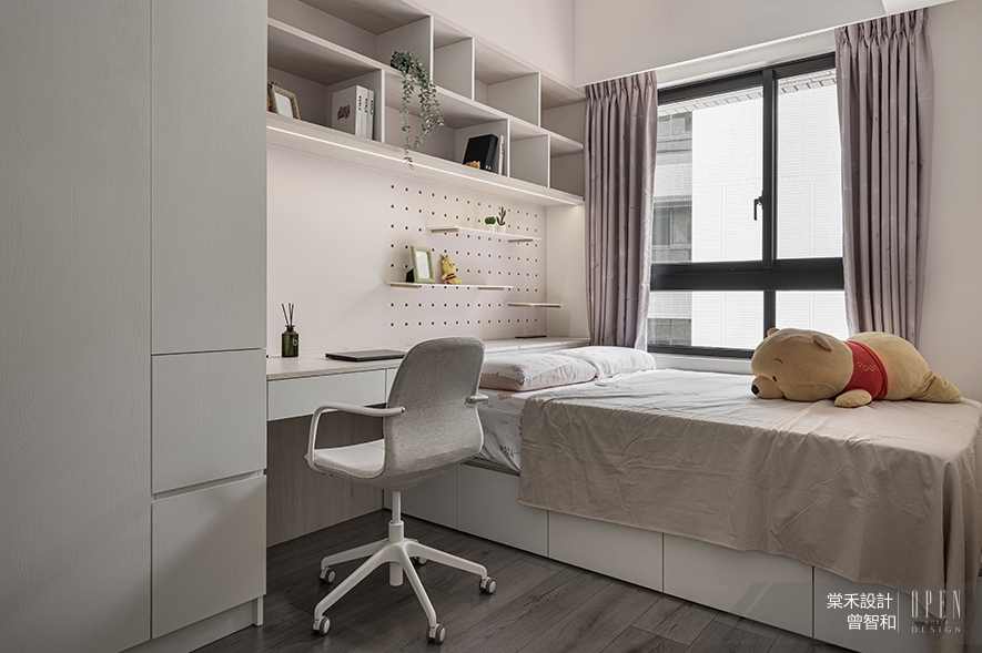 思及正處學齡的孩童,兩間次臥皆將書桌結合床頭櫃,提供孩子獨立學習的空間,床頭牆則分別規劃洞洞板及層板,令居者擺置心儀的公仔和玩具。