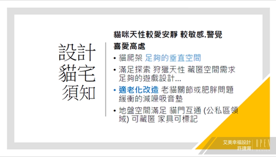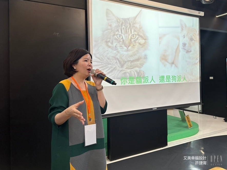 從當今寵物陪伴的趨勢談起,引出寵物與人的空間需求適切共融的必要性,再到貓、狗宅的具體設計方向,許總監因應「貓狗特性設計差異化需求」娓娓道來,且列出相關圖片幫助聽眾理解,全方位展現如何透過室內設計為寵物創造更舒適、安全的居住環境,引發現場與會者的熱烈討論和回響。