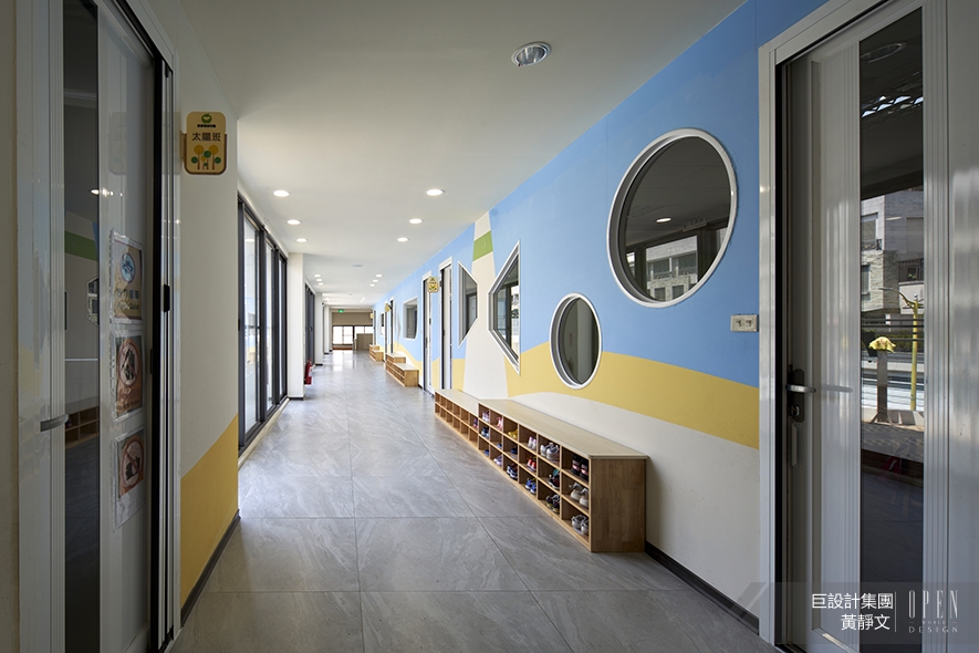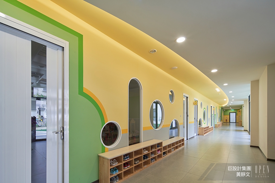 ▲走廊以繽紛色彩和弧線點綴,不僅呼應建築外觀造型,更彰顯幼兒園柔潤溫和的形象,令教學場域在自然天光、天壁柔光的托映下,呈遞輕盈和緩的氛圍。
