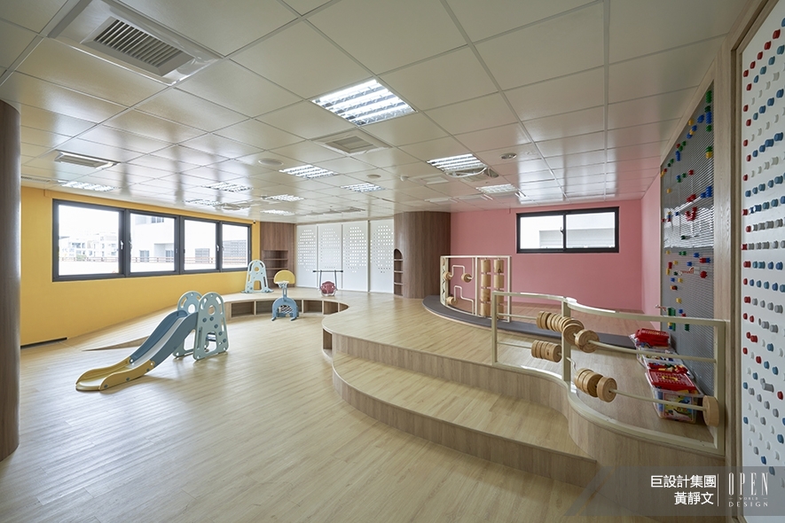 ▲室內遊戲室以流暢曲線劃出階梯及斜坡地坪,藉高低層次增添探索空間的趣味,並將益智玩具和欄杆、牆面結合,讓孩童在玩耍的過程也能激盪腦力、強化思考邏輯,達到寓教於樂的目的。