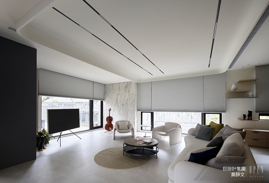 ▲在客廳場域前方、側面均為庭園前提下,設計團隊秉持「讓居者享有與自然環境更多互動」的信念,保留大量的落地窗,增加採光面積;同時調整電視牆擺設方式,僅設立式造型電視,與客廳渾然一體,將自然恬靜感帶入空間,極具鬆弛氛圍感。