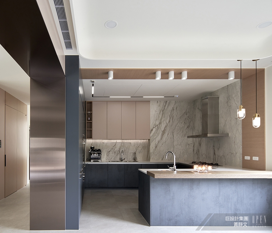 ▲餐廳與開放式廚房相連,L型廚具嵌入淺灰牆面,佐搭鐵件層架打造簡約美感。中島結合吧台,靈活運用為輕食區與工作台面,上方錯落的吊燈使其成為視覺焦點;一旁選用石材與木作交織的餐桌,搭配引入庭院綠意的穿透櫥窗,呼應「禪意休閒宅邸」的調性。