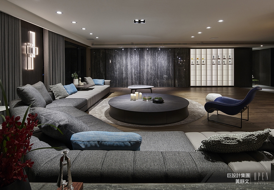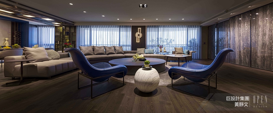▲用色低調的客廳中,正對入口的弧形沙發以環抱姿態迎接歸家者,而作為入門端景的大片落地窗本身即有優美景觀,便不多加裝飾,僅於中央懸掛一盞簡約壁燈,讓人靜心俯瞰城市街景、眺望遠山近海。