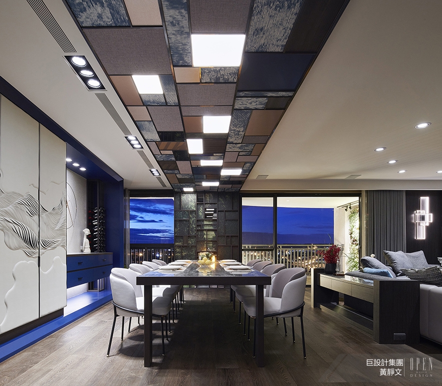 ▲餐廳從天花板延伸至窗畔的繽紛造型擷取「藍天綠地」的意象,上方使用天空紋路壁紙、鈦金、燈箱與壓克力,牆面則以大圖輸出為底,疊加水紋、直紋、灰玻等特殊玻璃,加以鐵件分割,完成一場精湛的異材拼接展演,同時善用建材餘料,兼顧設計美學與環保意識。