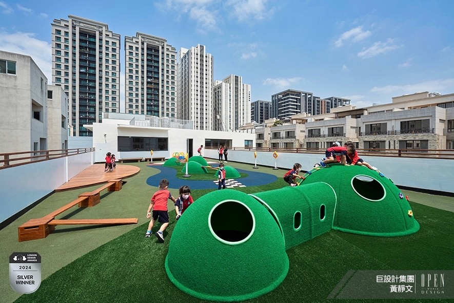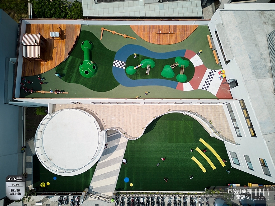 巨設計集團 執行長 黃靜文 思及兒童正處活潑好動的階段,於是將建築設於幼兒園基地後側,讓前方擁有足夠眾多幼兒跑跳玩樂的寬敞廣場,輔以頂樓配有跑道、小山丘、蹺蹺板和涼亭的戶外空間,以及位在室內的益智遊戲室,滿足孩子們多樣化的活動選擇需求;滿盈天真童趣的教育場所《流光趣憶》廣受評審團好評,一舉奪得2024 LONDON Design Awards的「銀獎」榮耀!