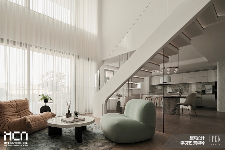 ▲視「通透」為作品核心,客廳以單椅取代量體較大的沙發,令光自在穿行於無壓場域,塑造輕盈柔和氛圍。