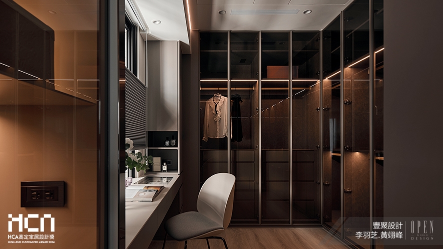 ▲為滿足屋主擁有獨立更衣室的想望,主臥拆除與次臥間的隔牆,並以柔靜暖灰色調鋪墊放鬆氛圍。僅以簡約線條與材質跳色勾勒表情輪廓,利用鋁框玻璃和茶鏡立面放大視覺,讓此區成為兼具精品收藏與個人展間的專屬VIP室。