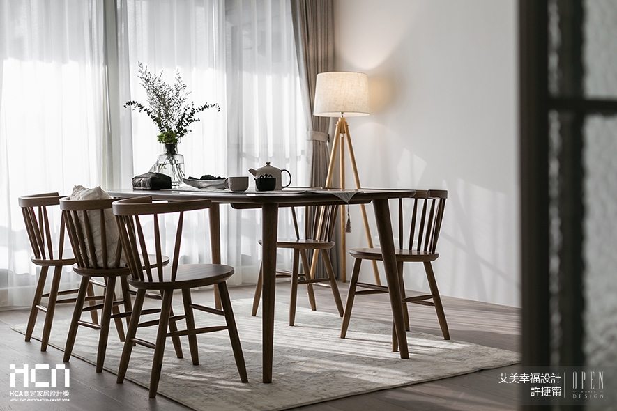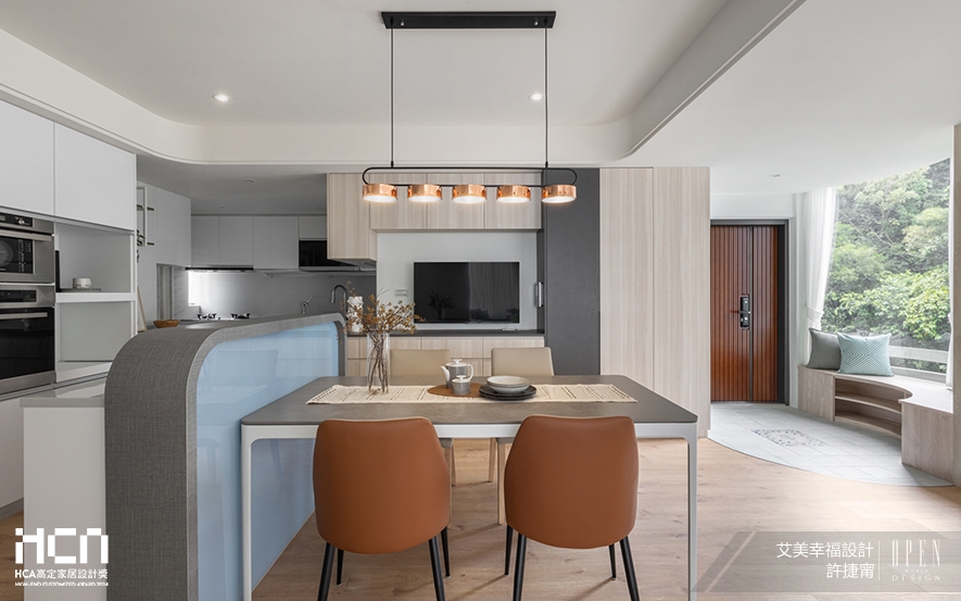艾美幸福設計 設計總監 許捷甯 一向以舒適溫馨、滿盈暖意的精緻作品為設計特點,於《瀲光雅寂》中捨棄客廳置入電視的傳統思維,並以木質長桌、單人椅取代體積較大的茶几沙發,為一家四口的伴讀時光鋪敘敞亮無擾環境;作品《清煦》則於屋中多處規劃柔潤曲弧相互呼應,輔以大片落地窗引入室外天然山景,創造清新無壓的北歐風韻。如此注重使用者居住體驗,且為其深入思考未來所需,貼心而專業的服務令艾美幸福團隊於本屆賽事中贏獲「年度城市十大高定家居空間設計師」的榮耀,令品牌美學一舉躍入國際舞台!